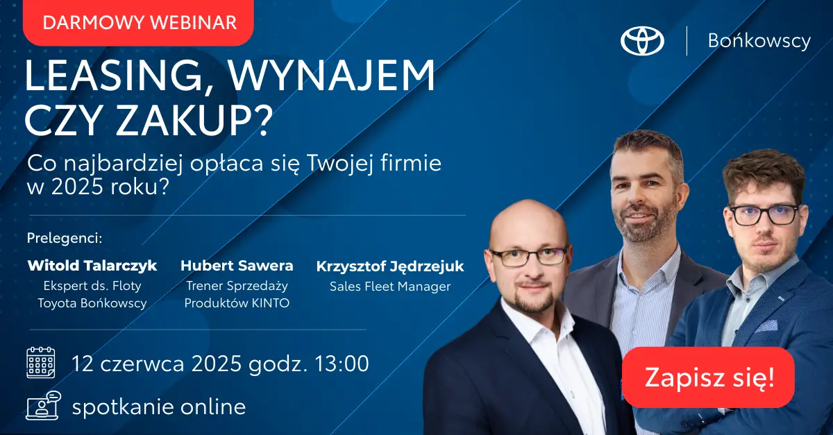 Od 2003 roku z przyjemnością towarzyszymy naszym Klientom w podróży po świecie Toyoty. Nie tylko jesteśmy największym dealerem w Wielkopolsce, ale również z dumą obsługujemy firmy na arenie ogólnopolskiej. Naszym celem jest nie tylko dostarczanie samochodów, ale przede wszystkim budowanie trwałych relacji opartych na profesjonalizmie i pełnym zrozumieniu indywidualnych potrzeb każdego Klienta. Nasz doświadczony zespół doradców pozostaje do Twojej dyspozycji, by pomóc Twojej firmie w zakupie nowoczesnej, ekologicznej i niezawodnej floty. Chcemy być Twoim partnerem nie tylko w podróżach, ale także w codziennych wyzwaniach biznesowych.
